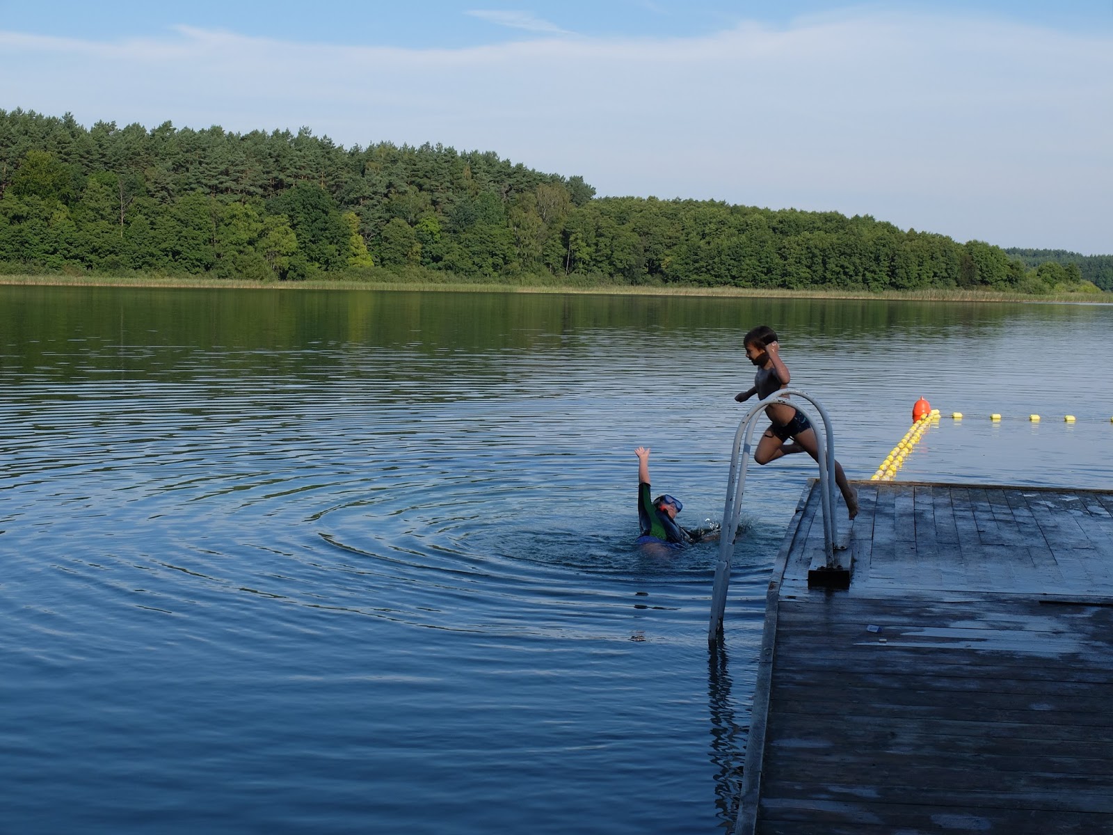 Island Camp na wyspie Ostrów. Spędziliśmy tam jedna noc i trochę mieliśmy pecha bo trafiliśmy na pijaków, co cała noc hałasowali. Tzn ja miałam pecha, bo nie mogłam spać, a Łukasz nawet słowa nie słyszał. Sam camping jest super położony w lesie nad samym jeziorem, kąpielisko jest strzeżone w ciągu dnia, można wypożyczyć rowery wodne i kajaki. Dzieci były zachwycone i jak tylko zjadły śniadanie to hop do wody :).